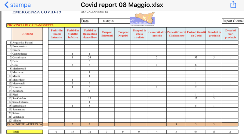 Bollettino giornaliero dell’Asp di Caltanissetta. “Permane il trend dei pazienti guariti da Covid. I guariti, precedentemente positivi a domicilio, sono 5 (1 a Caltanissetta, 1 a San Cataldo, 1 a Serradifalco, 1 a Mussomeli e 1 della provincia di Agrigento, quest’ultimo è stato trasferito dalla ex-Rsa al proprio domicilio).